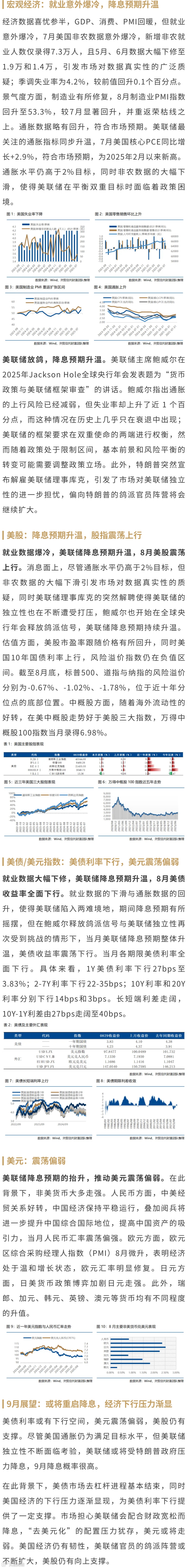 9月展望:美联储独立性面临挑战,降息概率较高,美债利率存在下行空间。美国经济下行压力显现,去杠杆进程趋缓,利好债市。市场担忧货币政策配合财政扩张,“去美元化”趋势持续,美元或维持弱势。经济韧性尚存,鸽派官员增多,美股仍具支撑。
