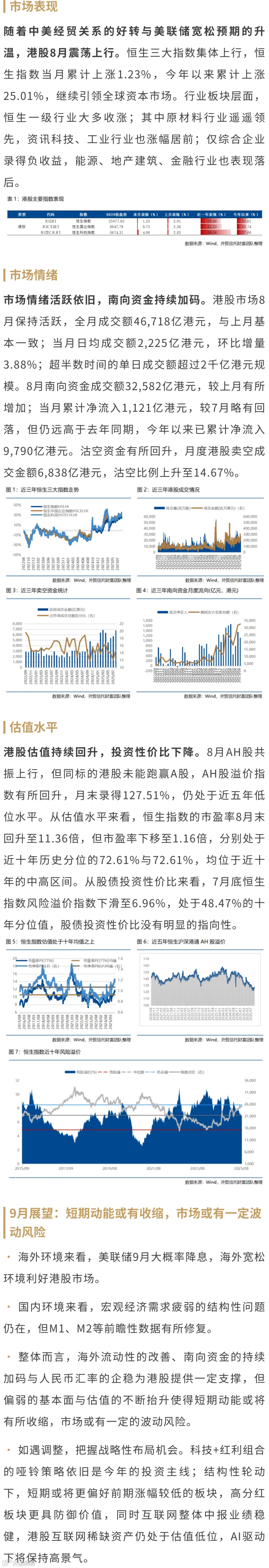 8月回顾:受益于中美经贸关系缓和及美联储宽松预期升温,港股震荡上行。恒生三大指数集体上涨,恒指当月涨1.23%,年内累计涨幅达25.01%,继续领跑全球市场。行业方面,原材料领涨,资讯科技与工业板块表现强劲;综合企业下跌,能源、地产、金融等板块相对落后。