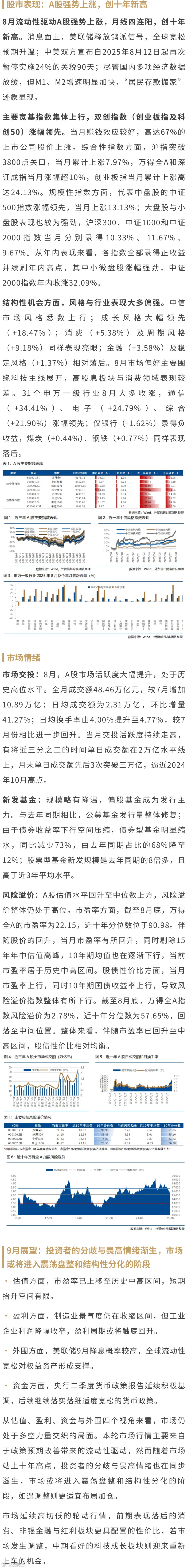 8月回顾:流动性驱动下,A股强势上涨,实现月线四连阳,创十年新高。主要宽基指数普遍上行,成长风格显著占优,科技主线成为市场偏好核心;消费与周期表现亮眼,金融及稳定风格相对滞后。市场交投活跃,日均成交额、换手率及杠杆资金热度明显提升,估值回升至历史中高水平。