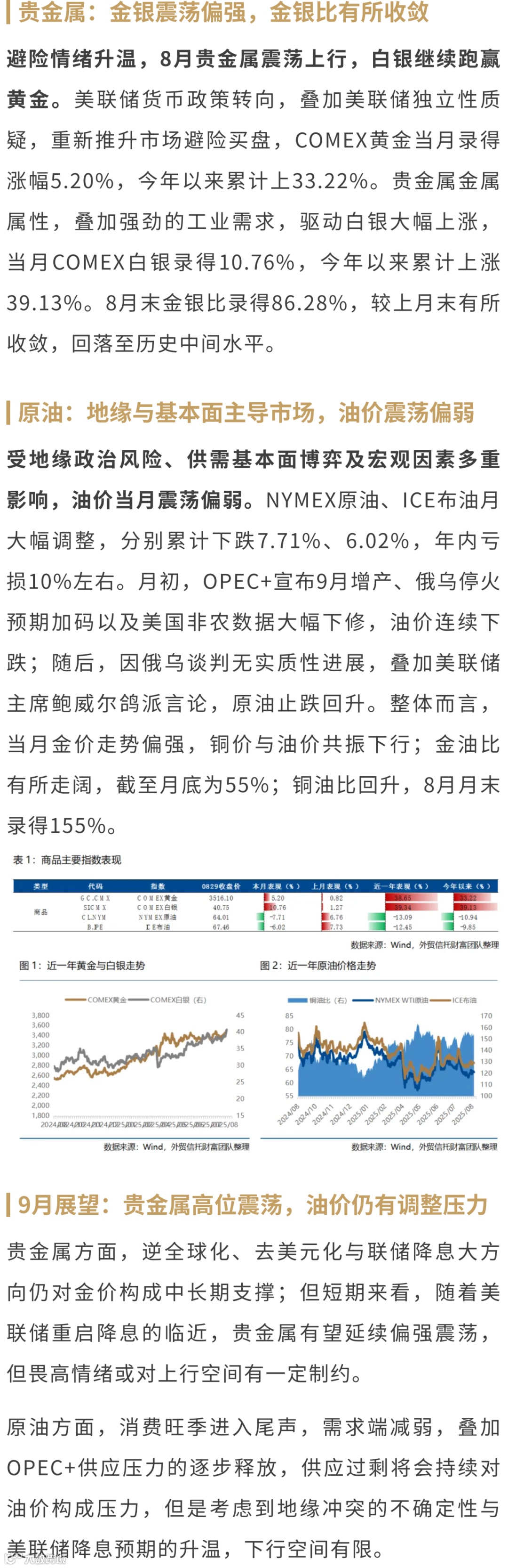 8月回顾:贵金属震荡走强,白银表现优于黄金,主因美联储政策转向预期及对其独立性的质疑推升避险需求。原油受地缘政治、供需博弈和宏观因素影响,价格震荡偏强。
