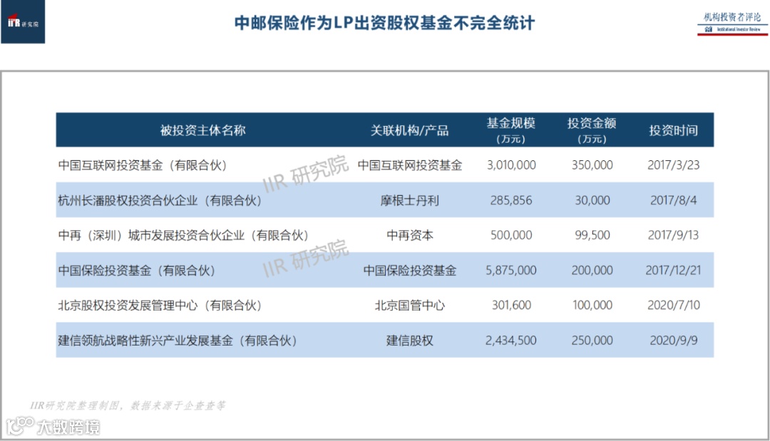 虽然中邮保险成立时间较早,但公开数据显示,中邮保险股权投资业务从2017年开始,主要以LP身份参与投资股权基金。