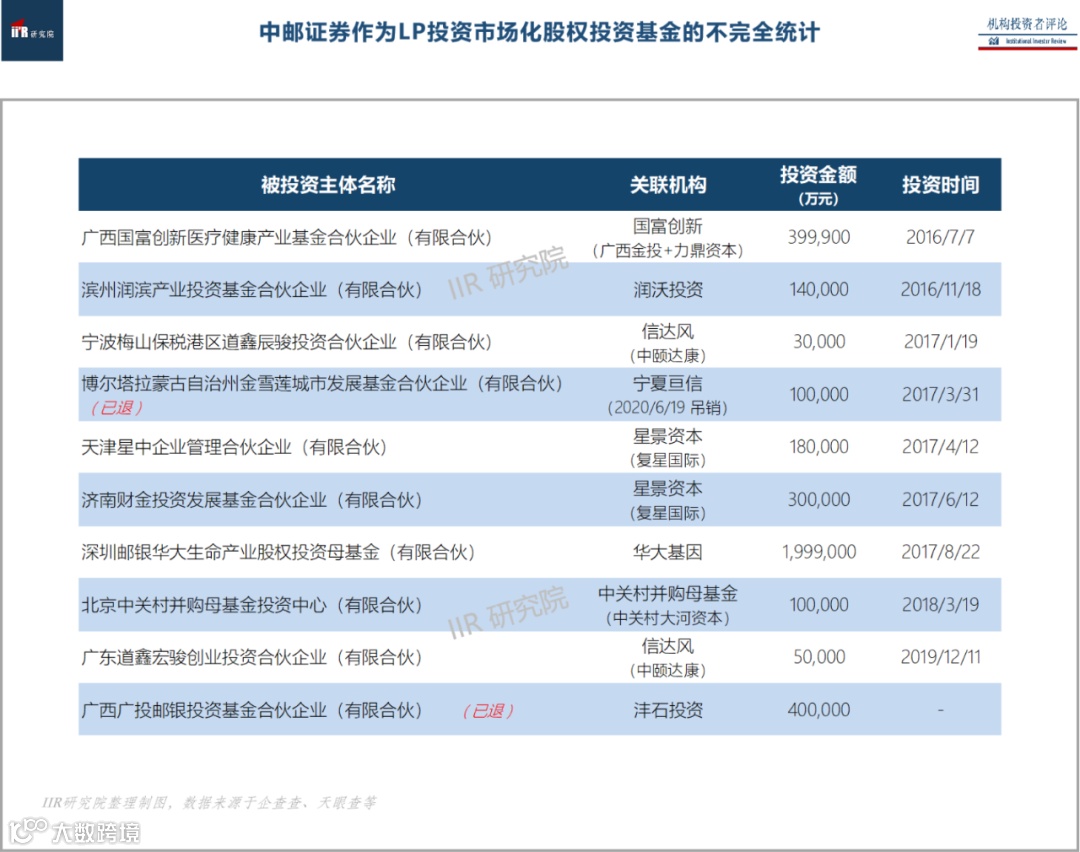而中邮证券在与市场化机构的合作上,主要合作模式可分为两类:一类是与实力较强的上市民企合作,如华大基因、复星国际;另一类是参与市场化机构、地方国资企业/投资平台作为新管理人共同发起设立的基金。