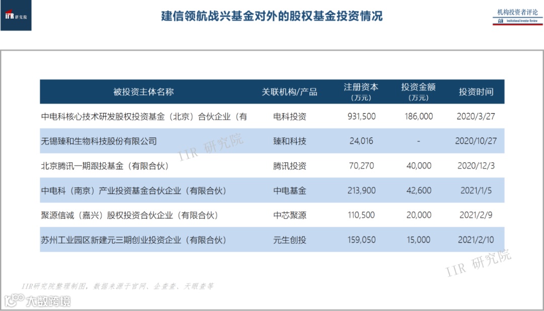 2018年底,建设银行拟与国家发改委共同发起设立战略性新兴产业发展基金。2020 年 9 月,中邮保险以25亿元出资由建信股权管理的基金建信领航战略性新兴产业发展基金(有限合伙)。据IIR研究院不完全统计,该基金目前已参与出资了腾讯投资、中电基金等多个专项领域产业基金,还直接投资了无锡臻和生物科技。