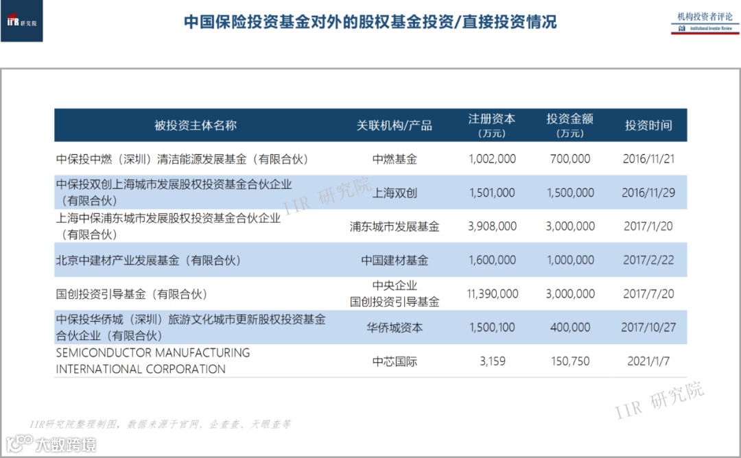 中国保险投资基金的对外出资肩负国家战略的功能性作用,据IIR研究院不完全统计,该基金目前已投资上海双创基金、浦东城市发展基金、中国建材产业发展基金、中燃清洁能源发展基金、华侨城旅游文化基金、国创投资引导基金等多只基金,并直接投资了中芯国际。