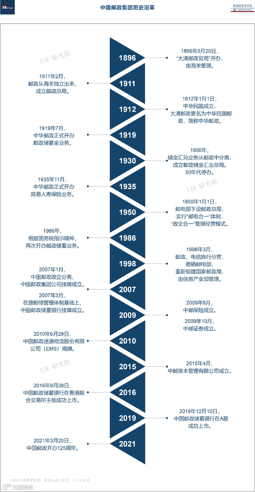 1)从1896年3月20日算起,刚刚过去的2021年3月20日,中国邮政已开办125周年。如今邮政集团体系的金融业务子公司包括邮储银行、中邮保险、中邮证券、中邮资本等,而结合邮政集团拥有的天然渠道优势,金融、投资板块对于集团邮政主业的反哺效应十分明显。