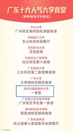 深圳北理莫斯科大学有个湖滨餐厅,位于学校中心湖畔,环境优美,设一层、二层就餐区。一层为自选称重窗口,二层供应中西式简餐、饮品等,三个各具特色的食堂为师生和游客提供了多样化的美食选择。其中,湖滨食堂紧邻湖畔,窗外美景为用餐增添了一份宁静与惬意。在2019年被评为“A级食堂”,2021年被评为“广东十大人气大学食堂”,2022年获得“健康食堂”荣誉称号。