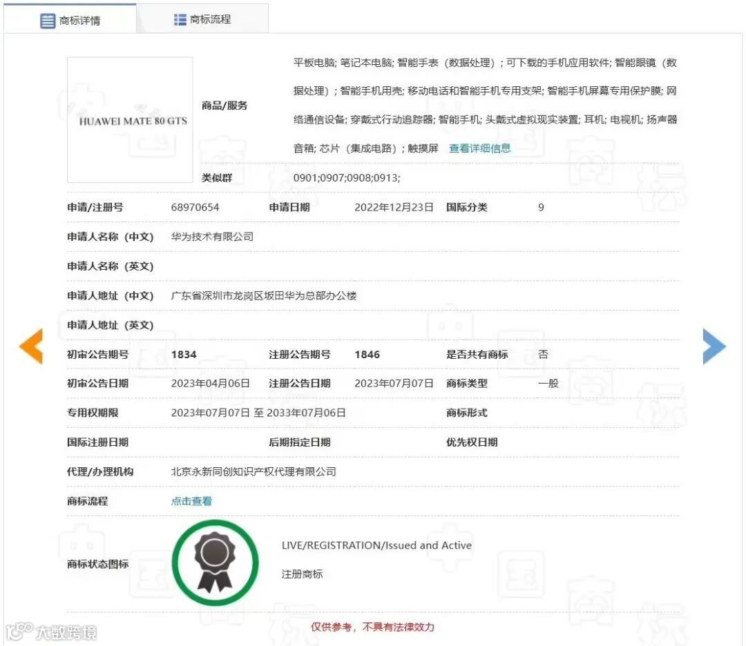 据国家知识产权局商标局公开信息显示,华为已正式注册“HUAWEI MATE 80 GTS”商标,其涵盖的商品与服务类别包括智能手机、手机保护壳、专用屏幕保护膜、平板电脑以及网络通信设备等。