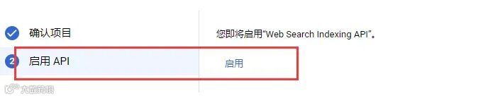 在 Google Cloud 控制台中搜索“Web Search Indexing API”,选择对应项目并启用服务。