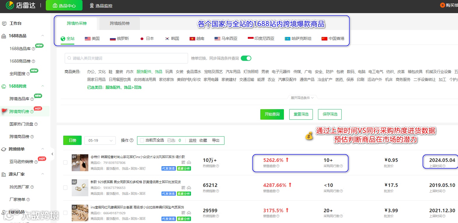 例如,卖家可以通过店雷达跨境选品工具查看不同国家和地区在年中时期各类目产品的销量走势,找出销量持续增长的潜力品类。跨境热销榜与飙升榜可以看到选择去年同期热卖1688跨境商品数据,商家可以提前准备类似或相关商品作为参考,避免盲目进货,抓住销售机会。