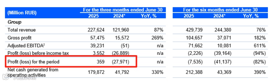 - 净利润为3.59亿卢布,同比扭亏为盈(去年同期亏损280亿卢布),标志平台迎来历史性盈利拐点。