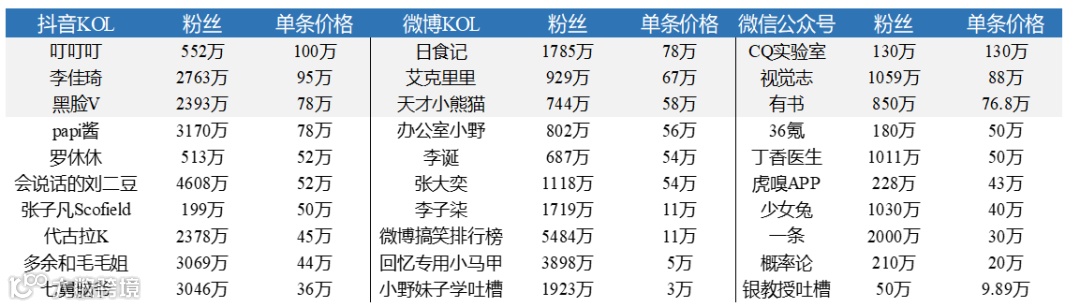 ▼ 各平台头部KOL报价极高(报价和粉丝为2019.07数据)