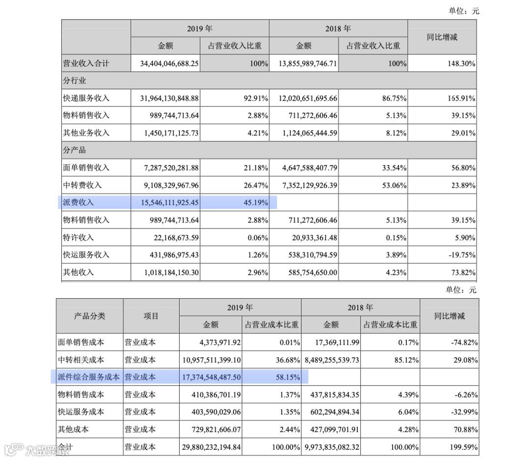 (韵达营业收入与成本表(部分),来源:韵达股份2019年度报告)
