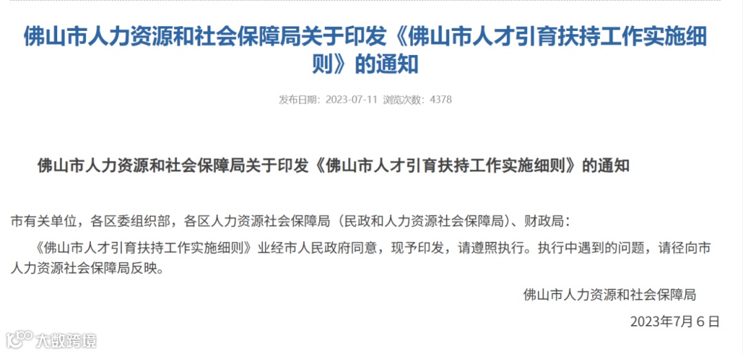 2023年7月,佛山市人力资源和社会保障局发布关于印发《佛山市人才引育扶持工作实施细则》的通知,本实施细则自印发之日起实施,有效期3年。