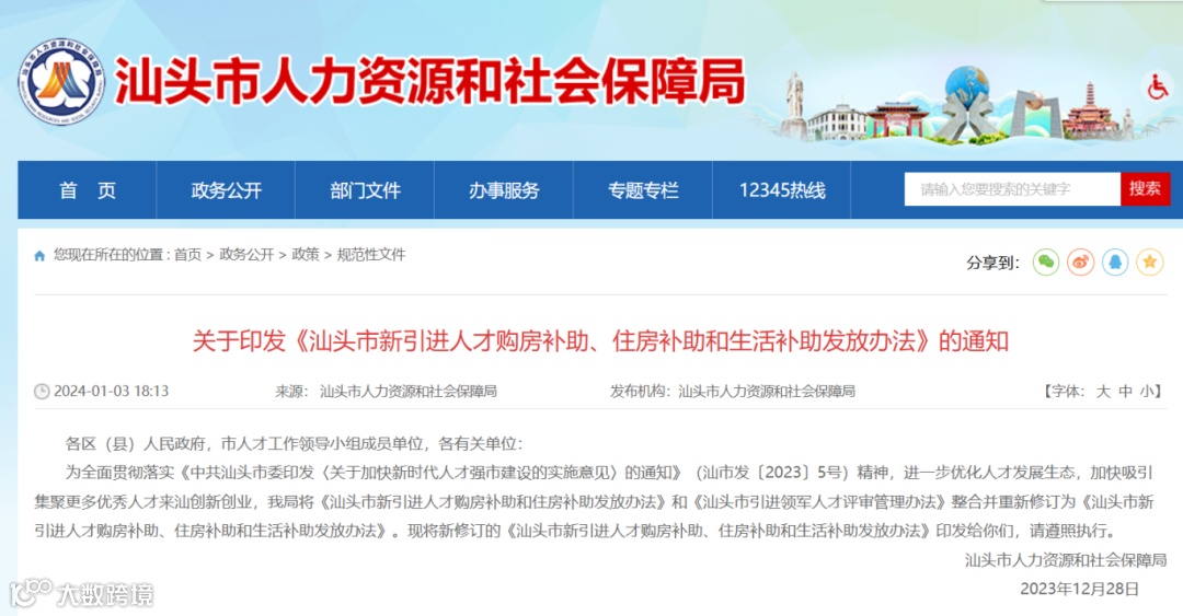 汕头市人社局发布关于印发《汕头市新引进人才购房补助、住房补助和生活补助发放办法》的通知,本办法自2023年12月28日起实施,有效期3年。