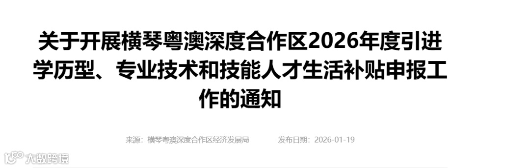 近日,横琴粤澳深度合作区经济发展局发布《关于开展横琴粤澳深度合作区2026年度引进学历型、专业技术和技能人才生活补贴申报工作的通知》。