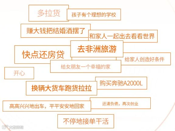95后货车司机也有自己的小目标,他们的目标大都与家人或对象有关,他们希望给家人更好的生活,朴实又浪漫。比如想给孩子找个理想学校、想和家人一起出去看世界、给女朋友一个幸福的家等等。这种浪漫还体现在长远的大目标上,如期待未来跑遍全国、成为CEO等,甚至超越马云或者去到外太空,看似天马行空却并非遥不可及。