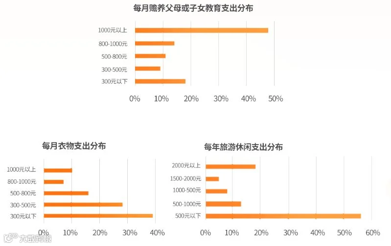但不管已婚还是未婚,他们都具备较强的家庭责任感,48%的人在每月赡养父母或子女教育的支出是1000元以上,而每月衣物消费和每年旅游休闲的支出基本都在500元以下。
