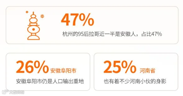 杭州的95后司机大半是安徽人,占比47%。其中,安徽阜阳市仍是人口输出重地,占比为26%。另外,杭州的95后司机群体也有着不少河南小伙的身影,占比为25%。在杭州用户眼里,他们和气又靠谱。