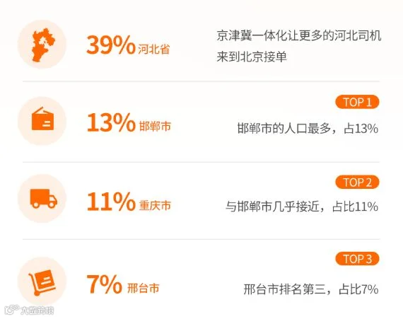 到北京跑货拉拉的95后,来自河北省的占比为39%,其中来自于邯郸市的人口最多,占13%。而人口来源数排名第二的城市是重庆,占比11%,与邯郸市几乎接近,排名第三的城市为邢台市,占比7%。他们是北京用户眼里的「中国好司机」。