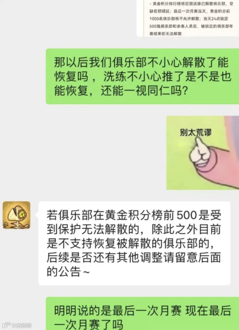 其次,对于玩家的质疑,客服回复称是因为进入了年赛准备阶段,前500名的俱乐部都会进入保护阶段,不允许解散。然而,这与官方公告内容明显矛盾。公告明确写着:“最后一次月赛当天,黄金积分前缺名额顺延1000名俱乐部将不允许解散;当天24点锁定500强俱乐部和参赛人员后,被锁定的俱乐部年赛结束前无法解散!”