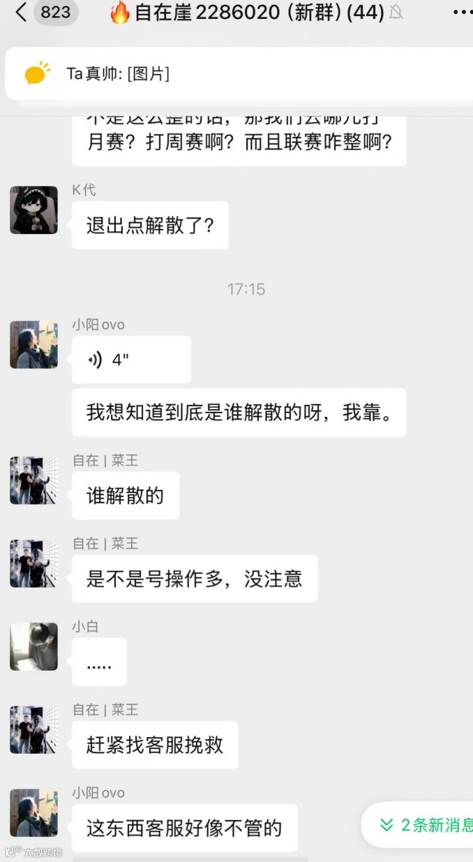 有玩家爆料称,解散操作并非团长所为,很可能与之前使用过的机器人有关。无奈之下,自在崖只能想办法找其他俱乐部的壳子来参加年赛。