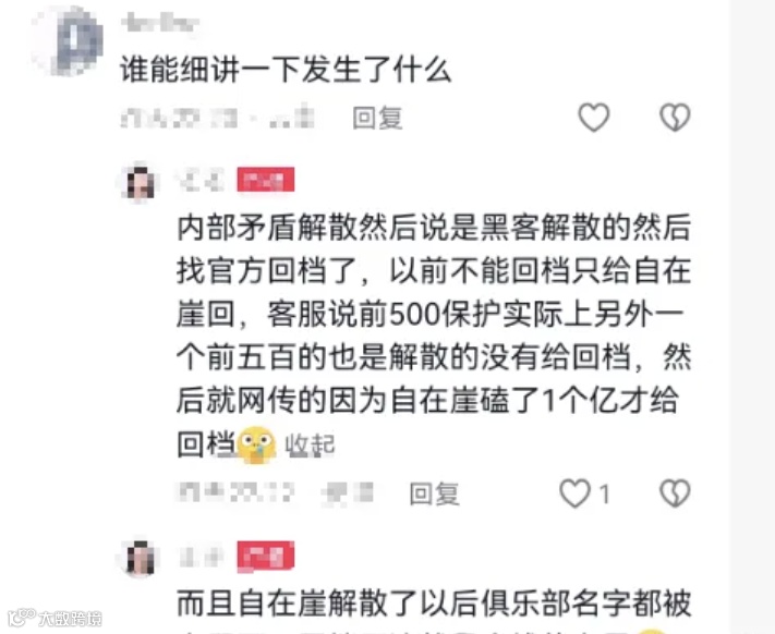 还有玩家爆料,是自在崖内部出现矛盾导致解散,然后谎称是黑客所为,进而找官方回档。而且以前不能回档,这次却只给自在崖回档。客服称前500名俱乐部有保护机制,可实际上另外一个前五百名的俱乐部解散后却并未回档。于是,网上便流传起自在崖是因为氪金一个亿才获得回档特权的说法。此外,自在崖解散后,俱乐部名字都被别人占用了,回档后这情况,真让人感叹金钱的力量。