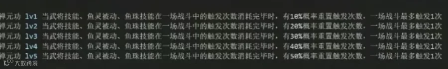 禅元功在游戏中有着独特的作用机制,当武将技能、鱼灵被动、鱼珠技能在一场战斗中的触发次数消耗完毕后,它有一定概率重置这些技能的触发次数,不过一场战斗最多触发 1 次。不同等级的禅元功,重置概率也有所不同: