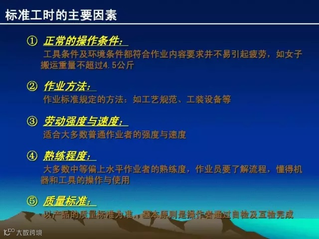 所谓的标准工时,就是指在正常条件下,一位受过训练的熟练工作者,以规定的作业方法和用具,完成一定的质和量的工作所需的时间。