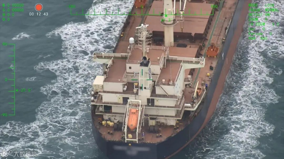 2025年5月,吴淞海事局利用无人机巡航至长江口B通道附近水域时,发现马朱里籍“康*”轮在航行过程中未按规定悬挂中国国旗。航拍画面显示,该船尾桅杆位置空置,缺乏应有标识,在往来船舶中尤为显眼,涉嫌违反我国相关法律法规。