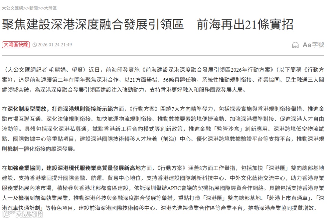香港特区政府认为,《行动方案》凸显了前海高质量发展的视野与决心,方案提及的发展方向,对进一步推动两地规则衔接、机制对接,深化双方合作与交流具有重大意义。 特区政府各政策局正积极研究《行动方案》的各项举措,将持续支持前海发挥先行先试功能,推动更多政策创新突破,共同推动大湾区高质量发展。