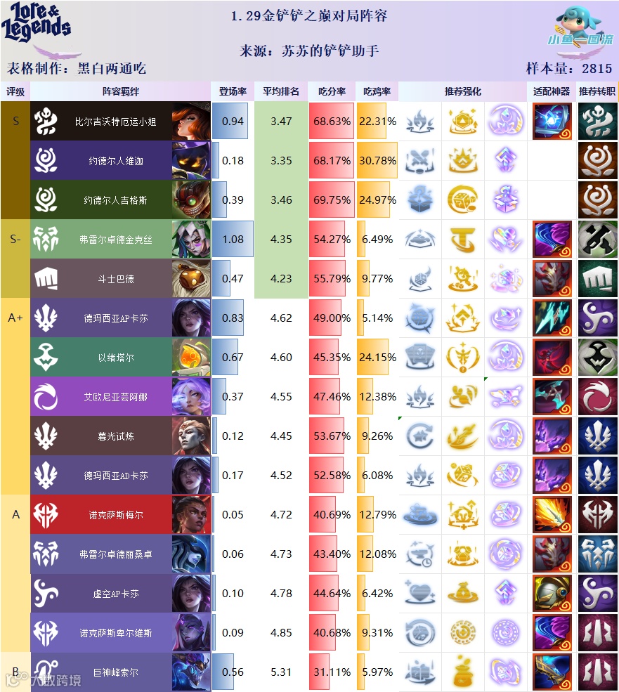 「铲铲S16榜单」2815把顶端局统计,主推比/约/金克丝/月男/德玛/以绪/艾欧!