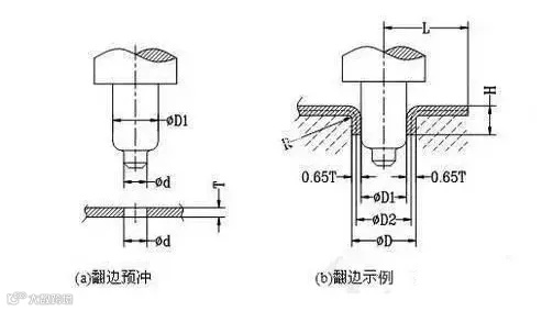 D=D1+(D-D1)=D1+1.3T;为了保证翻边D的垂直度,在一般情况下D≤D1+1.3T。