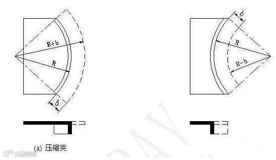 外缘翻边分外凸轮廓翻边和内凹轮廓翻边两种型式;外凸轮廓的翻边也称压缩类翻边,内凹轮廓的翻边也称伸长类翻边,见下图:
