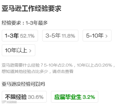 就拿深圳来说,目前在做亚马逊运营的人中,对于学历的要求并不是很高,有数据调查显示,亚马逊运营中的大专学历占57.2%,本科学历仅占28.8%。同时,在工作经验要求方面,1-3年的经验最多,数据占比达到了52.1%。另外,对于亚马逊招聘中不限经验的占30.6%,应届毕业生占3.2%。