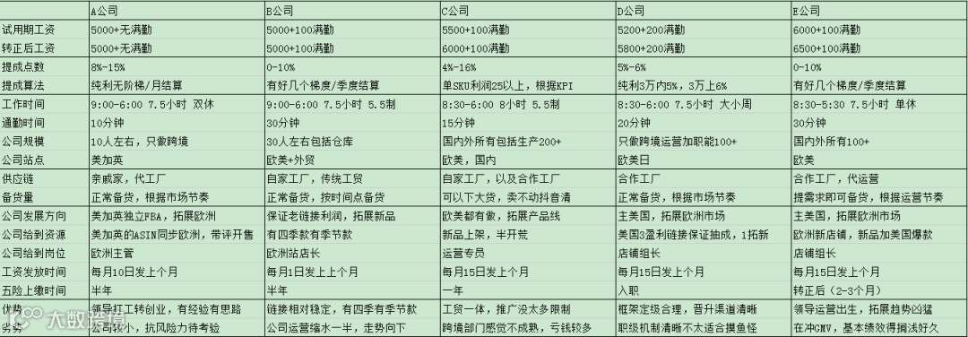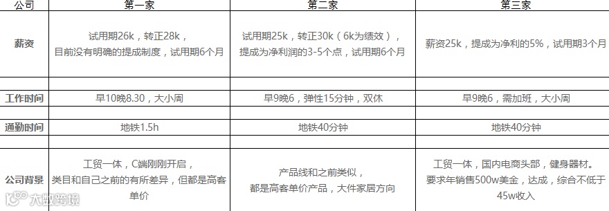 一位做亚马逊五年多,坐标杭州的运营表示,目前收到了3份offer,给的都是亚马逊运营经理岗位,但是因为给出的待遇不同,陷入了纠结当中,具体情况大家也可以看一下下列表格。