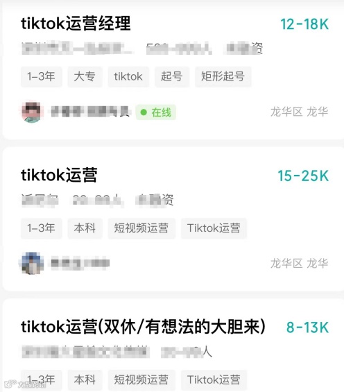 打开某招聘软件,搜索TikTok的相关职位,其中不乏有针对应届生或是小白运营的岗位招聘,尤其是深圳地区尤其地多。而店铺运营、短视频运营、社媒运营等等,都是目前跨境电商企业针对TK版块热招的职位。