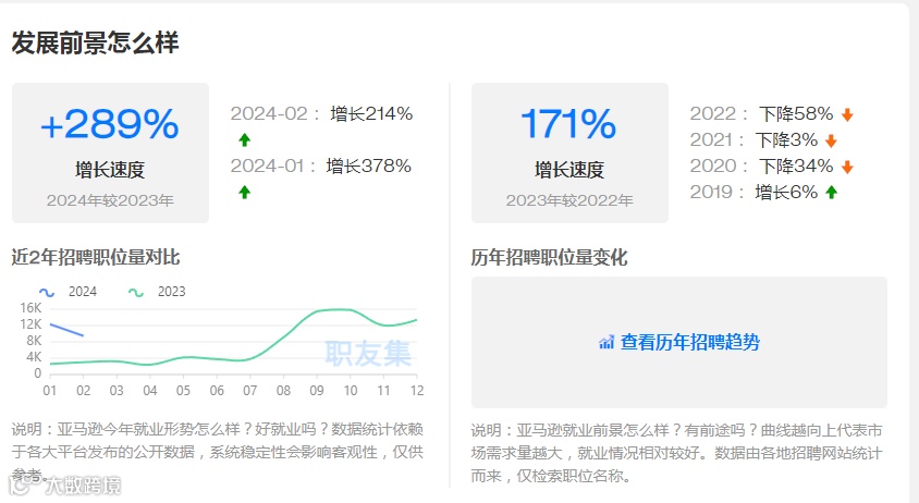 另外,有数据显示,亚马逊相关岗位的市场需求,2023年较2022年增长了171%,2024年较2023年同期对比增长289%!