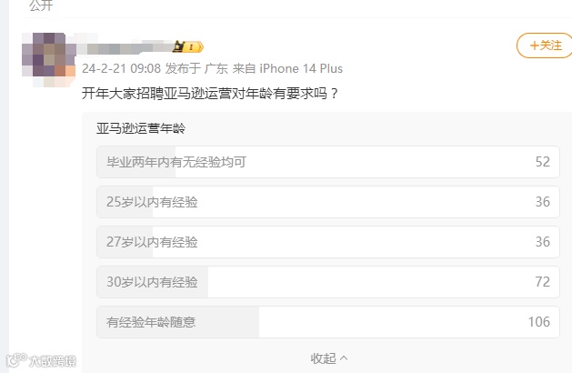 可以说,目前的亚马逊运营在学历和经验上并没有卡得太严。还有博主针对招聘亚马逊运营是否有年龄要求做了一个小调查,其中有经验年龄随意的选择最多,其次是30岁以内有经验。不过还是有卖家表示,自己不会招聘没有经验的亚马逊运营,毕竟培养成本太高。