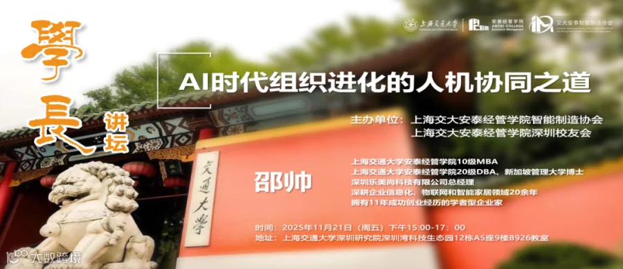 2025年11月21日下午,由交大安泰智能制造协会、交大安泰深圳校友会、交大安泰EMBA广东校友会联合主办的“学长讲坛”在深圳行业研究院成功举办。本次活动以《AI时代组织进化的人机协同之道》为主题,特邀上海交通大学安泰经管学院2010级MBA、2020级DBA、新加坡管理大学博士、深圳乐美尚科技有限公司创始人邵帅校友,结合其在个人研究与企业数字化转型的实践经验,为在场管理者深入剖析了从“超级个体”到“人机公司组织”的演进路径。
