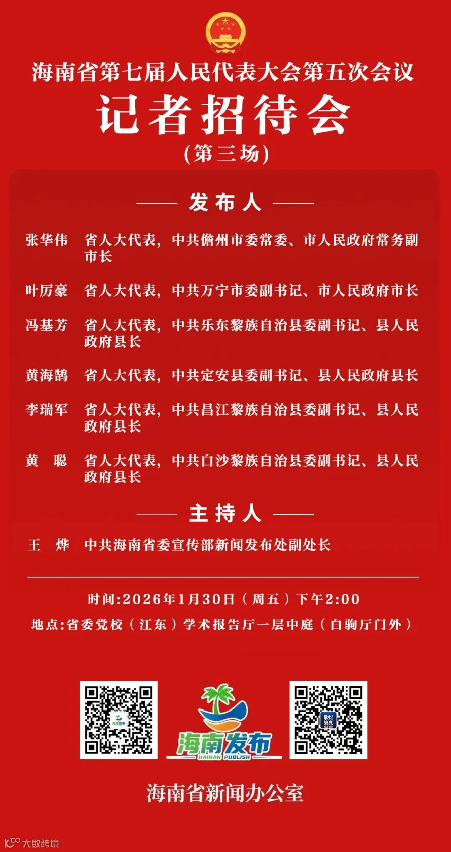 预告丨海南省第七届人民代表大会第五次会议记者招待会(第三场)将于明天下午举行