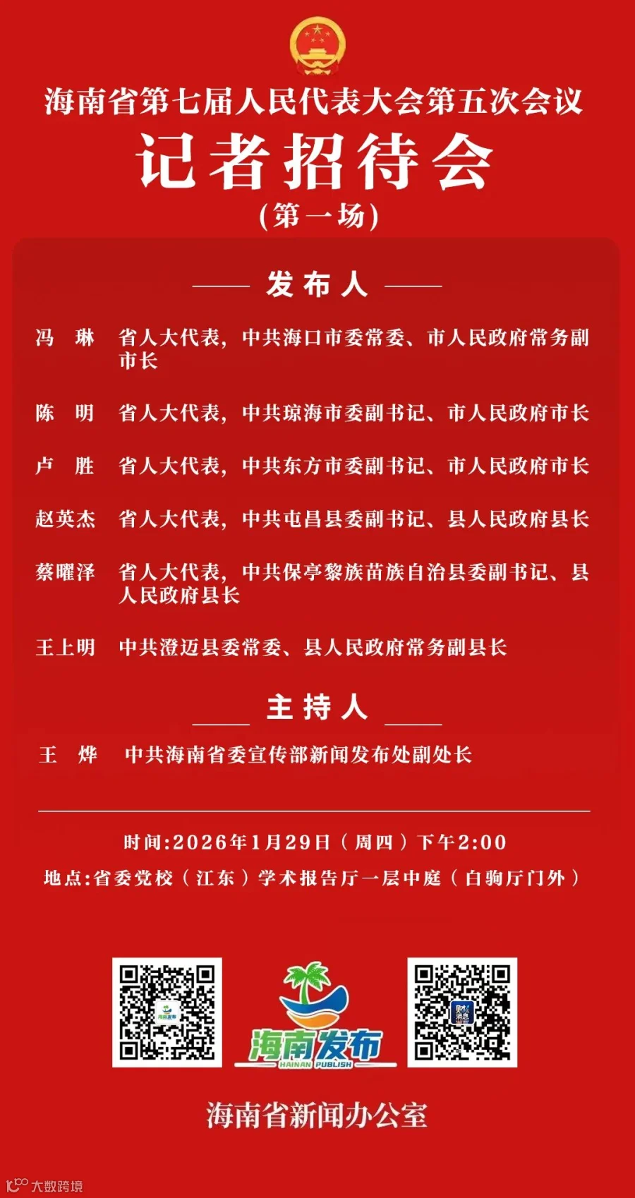 预告丨海南省第七届人民代表大会第五次会议记者招待会(第一场)将于明天下午举行