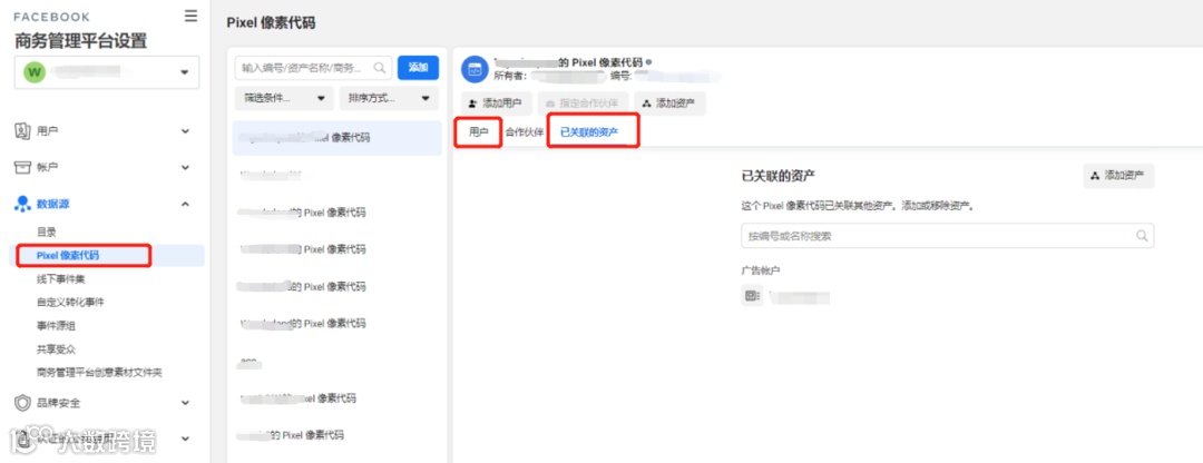 在商务管理平台BM左侧栏“数据源”的“Pixel像素代码”中可以查看BM下的Pixel像素代码,每个Pixel像素已关联的广告账户以及有像素权限的Facebook个人账号。