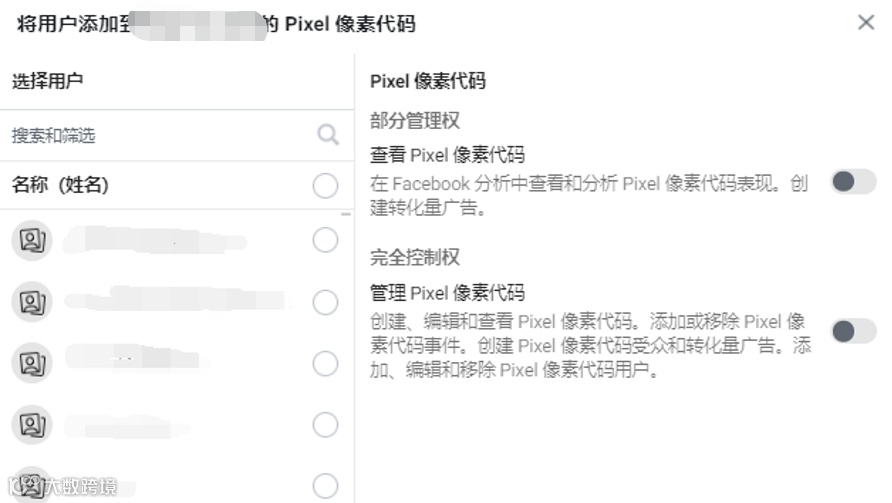 点击“添加资产”即可为Pixel像素关联Facebook广告账户。点击“添加用户”即可为Pixel像素添加用户并分配权限。