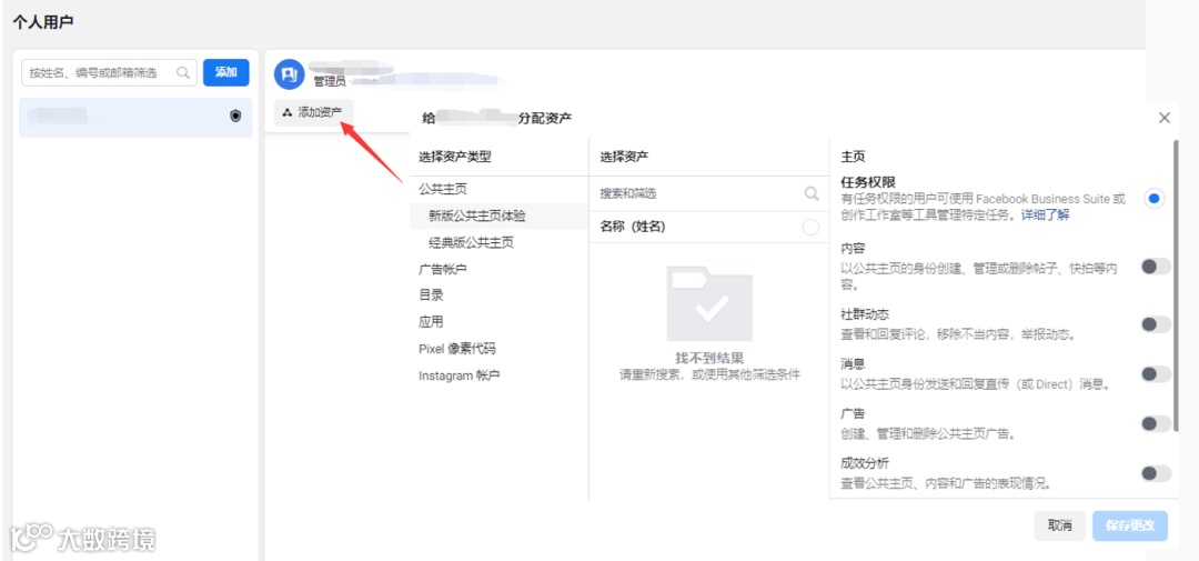 在检查的过程中如果发现有用户缺少需要的资产权限,可以点击“添加资产”为其分配Facebook公共主页、Facebook广告账户、目录、应用、Pixel像素代码等资产的权限。