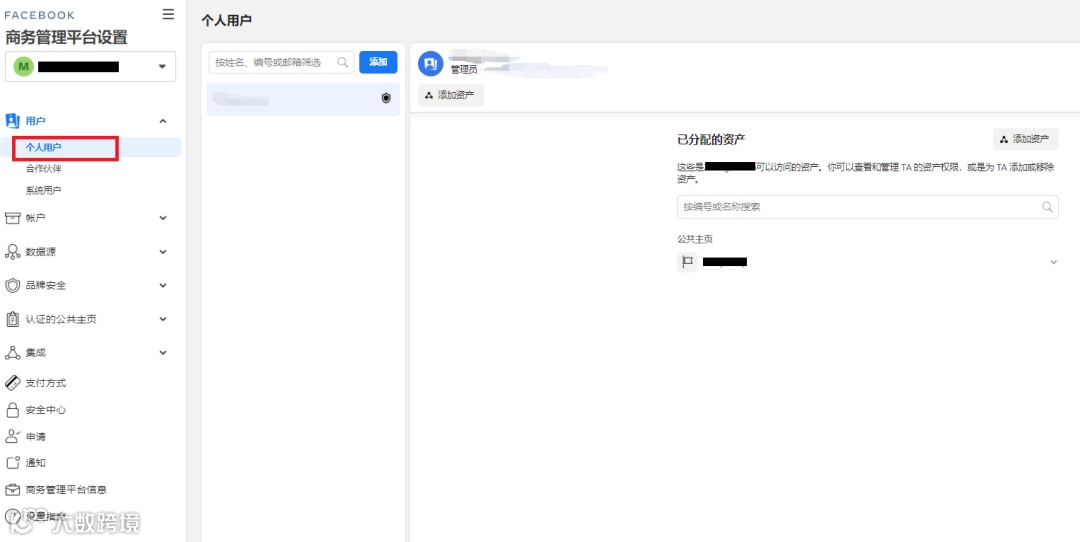 在商务管理平台BM左侧栏的“个人用户”中可以查看有权访问BM的Facebook个人账号,点击用户可以看到其有权限的BM资产。