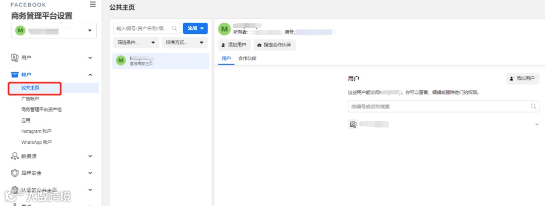 在商务管理平台BM左侧栏“账户”的“公共主页”中可以查看BM下的Facebook公共主页,以及主页内有权限的Facebook个人账号。