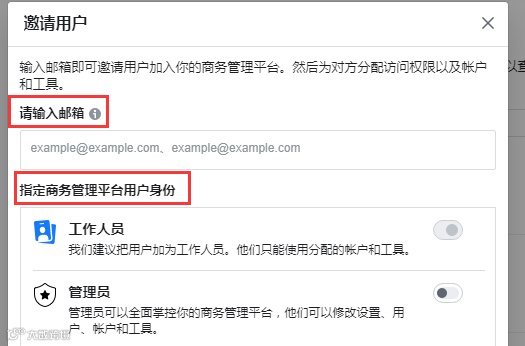 在BM的“个人用户”栏目中点击“添加”即可邀请用户,填写Facebook个人账号注册用的邮箱,并选择其商务管理平台身份,如管理员或工作人员。