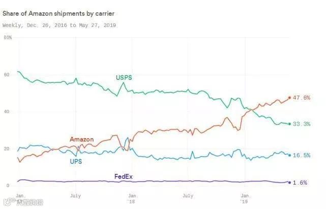 随着自身运输能力的提高,亚马逊对联邦快递、UPS和美国邮政服务的依赖有所下降。美国邮政服务公司曾是亚马逊包裹业务的主要承运商,如今递送的包裹份额只是两年前的一半。