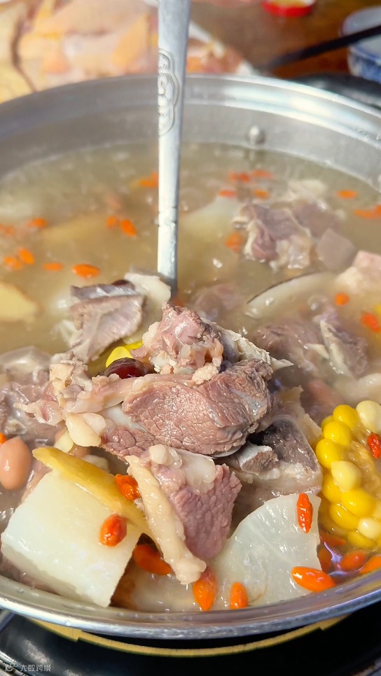 清水锅汤底加了老椰子、玉米、党参、枸杞、生姜、花生......虽然是清水煮但是羊汤鲜而不膻,羊肉要蘸上当地的特色调料一起吃:辣酱、腐乳和店家的秘制蘸料。羊肉皮弹肉韧,是当地人喜欢的有嚼头的口感;相比之下,干煲的做法口感更韧了,还是清水锅更让Jason觉得惊艳。