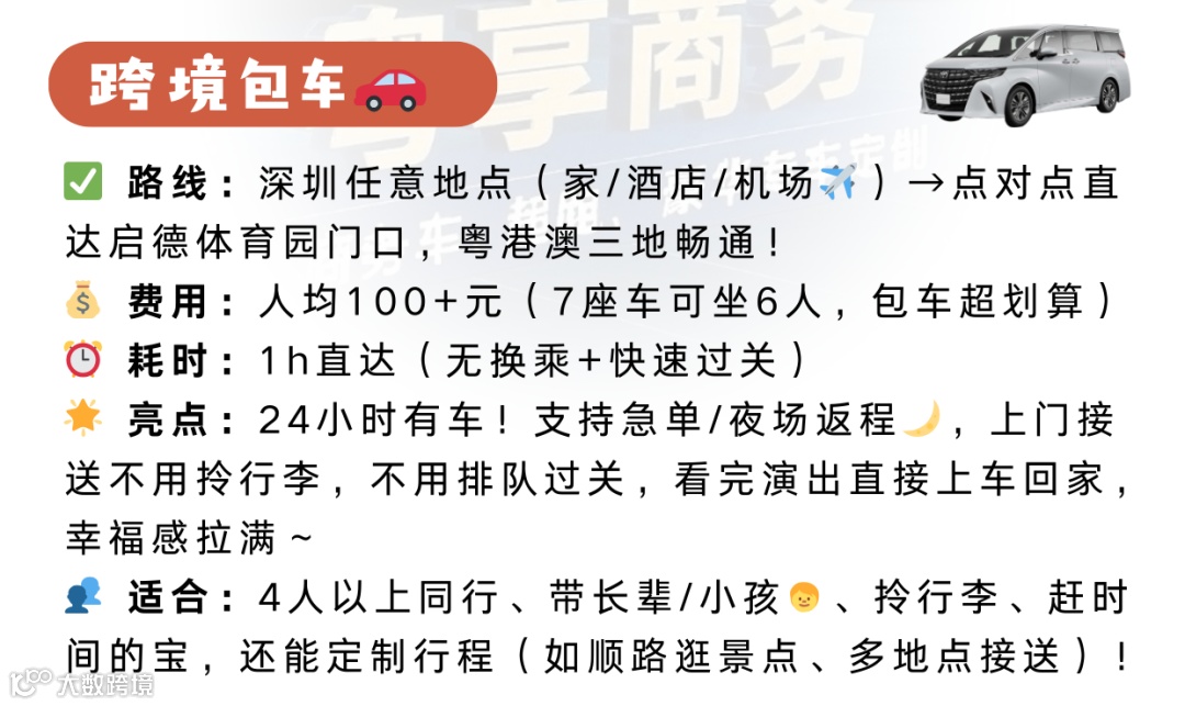 ✅ 路线:深圳任意地点(家/酒店/机场✈️)→点对点直达启德体育园门口,粤港澳三地畅通!